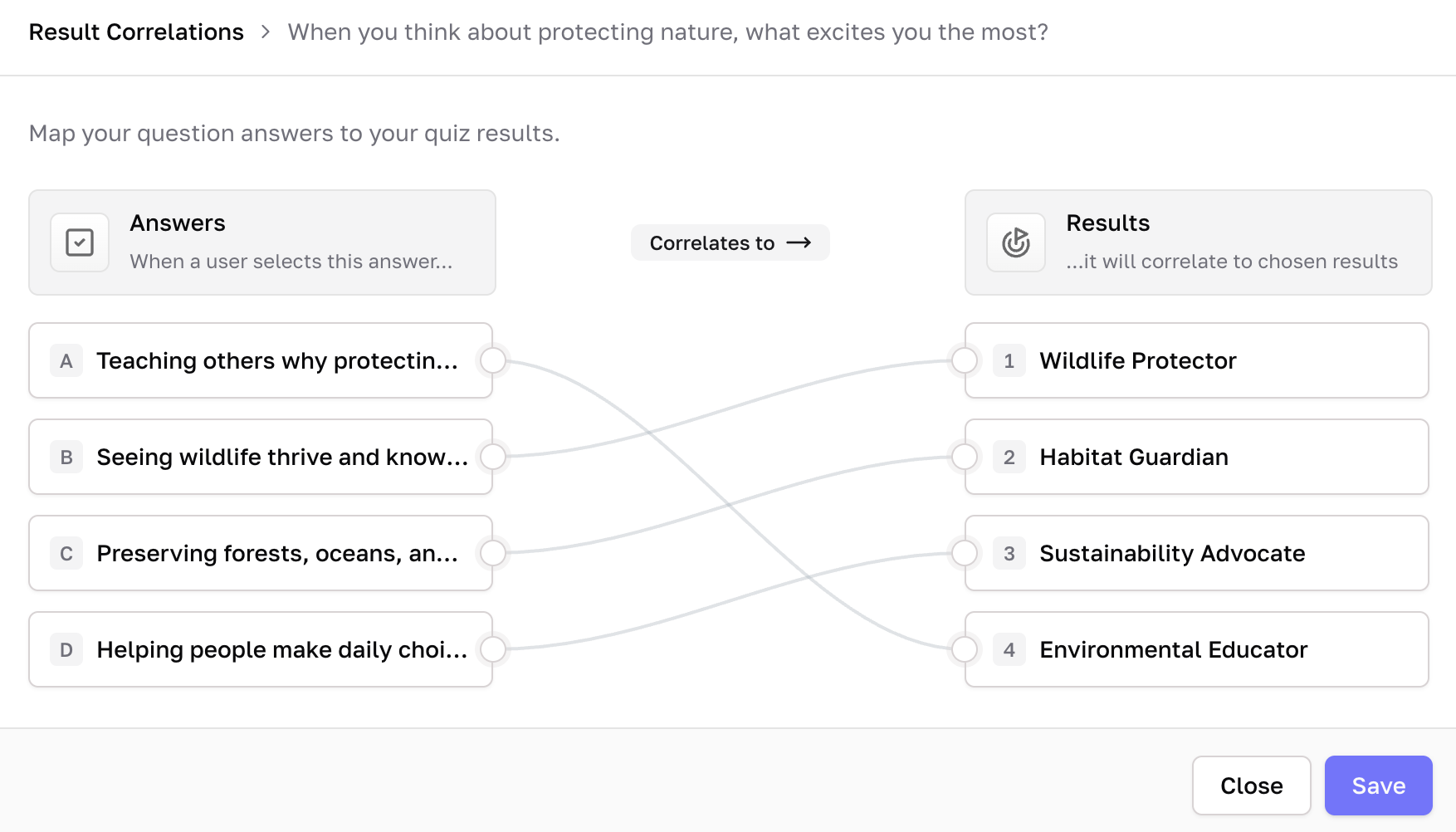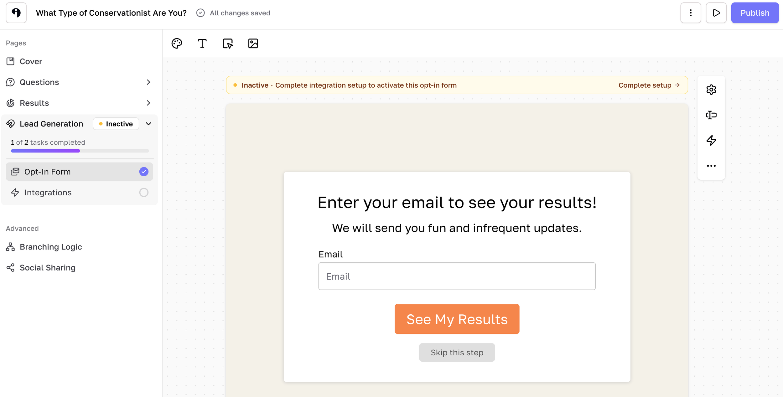 You enter your questions and answer options (the answers can also have images or gifs to make it even more fun!) and add the final results. Then match the answers to each result, set up the opt-in form, connect your email marketing platform, and you’re done!