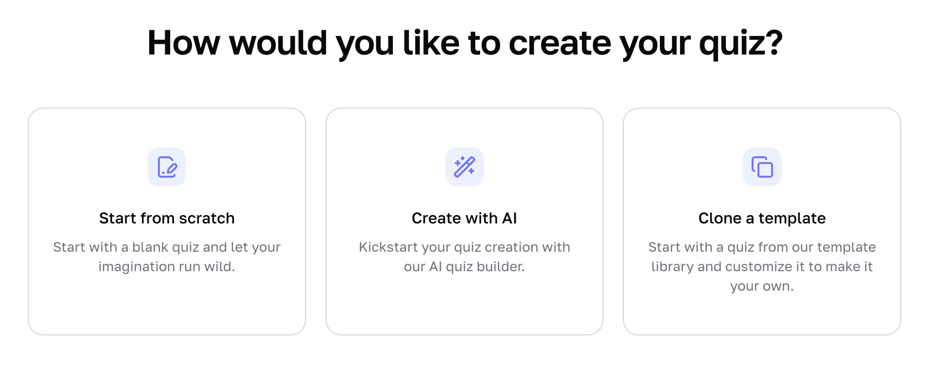 Select how you want to create your quiz: from scratch, with AI or start with a template